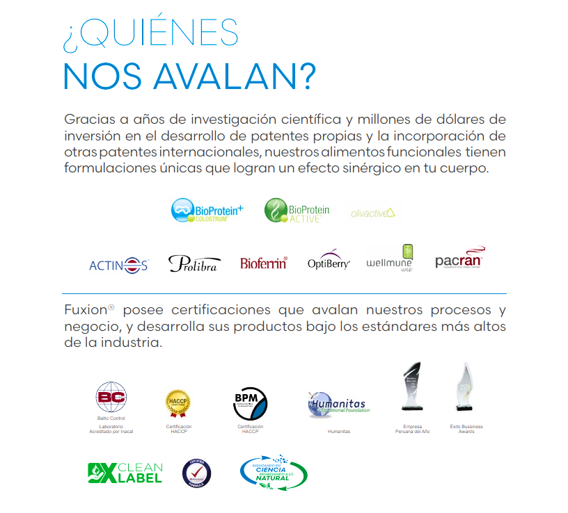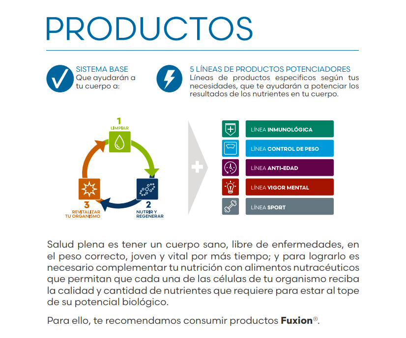 Los productos de FuXion® son alimentos nutracéuticos únicos, que producen resultados asombrosos en tu cuerpo. Son resultado de la fusión de los conocimientos de milenarias culturas (andinas, amazónicas y asiáticas) en el uso de alimentos para mejorar la salud, y los últimos avances científicos en biología celular y nutrición humana. A eso le llamamos FUSIÓN NUTRACÉUTICA®